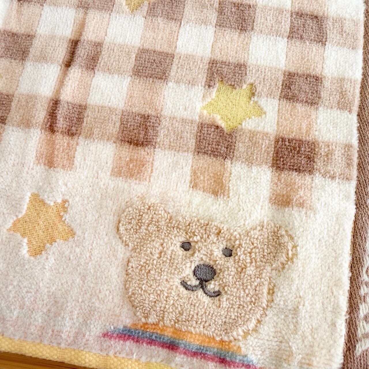 淡い色のチェック柄に、淡い色の可愛らしいお星様が散りばめられたやさしい色合いのウォッシュタオルです。